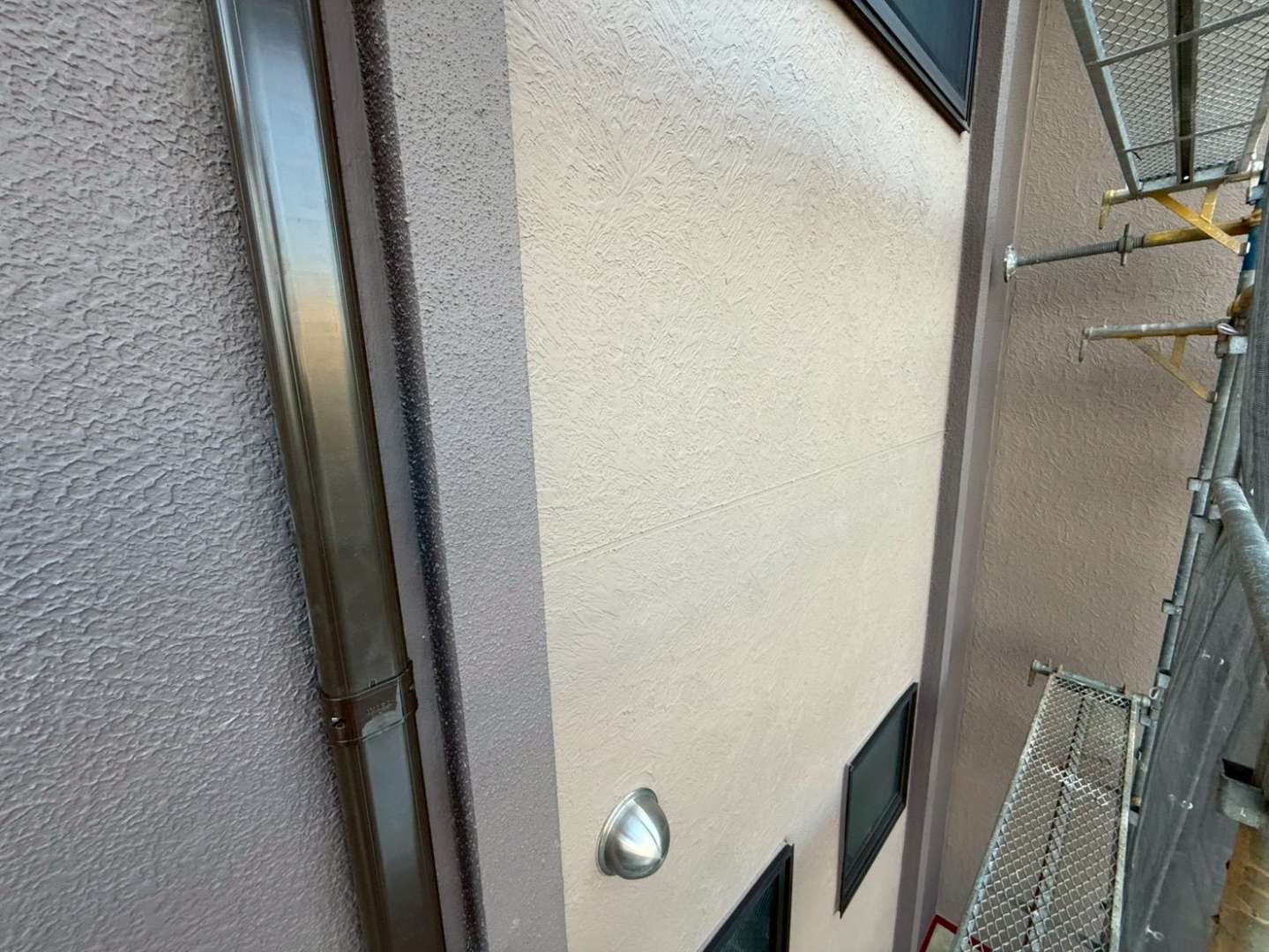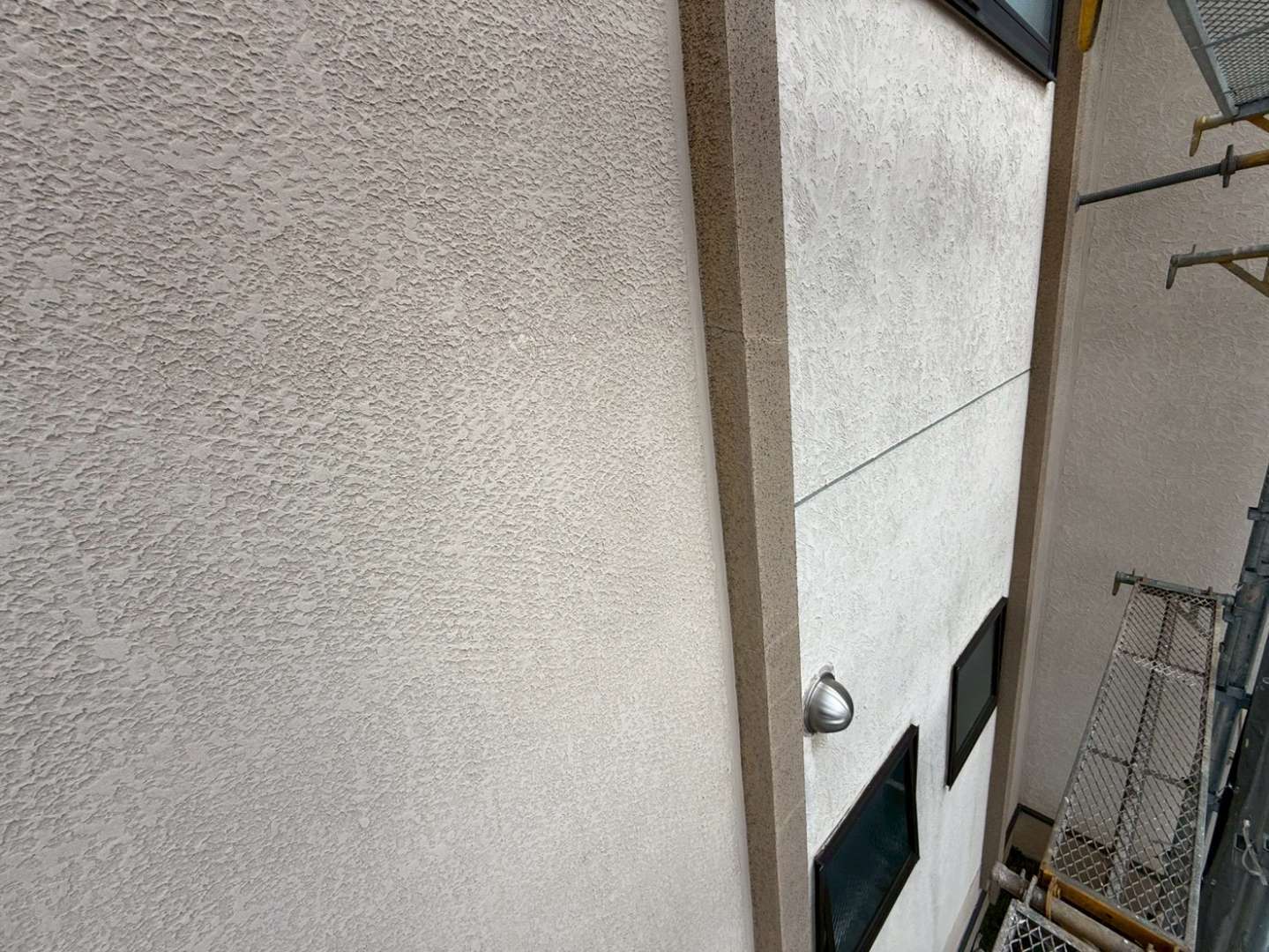 外壁はモルタル仕上げで、表面には経年劣化による色あせと細かなクラック(ひび割れ)が多く見られました。