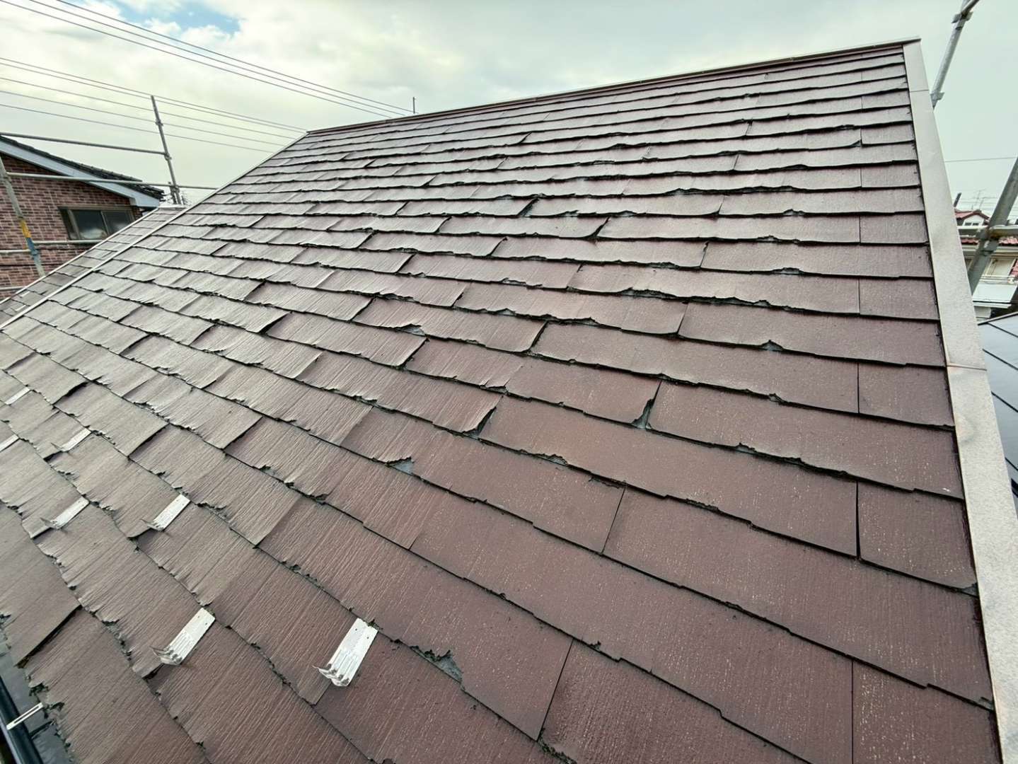 一見すると一般的なスレート屋根に見えますが、パミールは1996年〜2008年頃にかけて多くの住宅で使用されていた屋根材で、経年劣化により層状剥離・反り・割れ・釘抜けなどの症状が多発することで知られています。